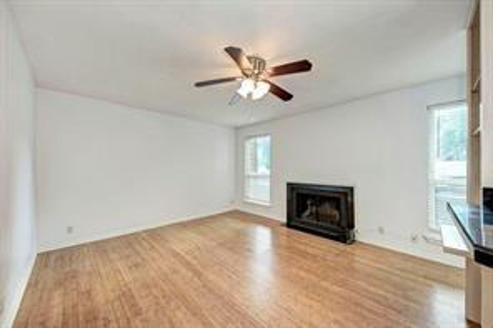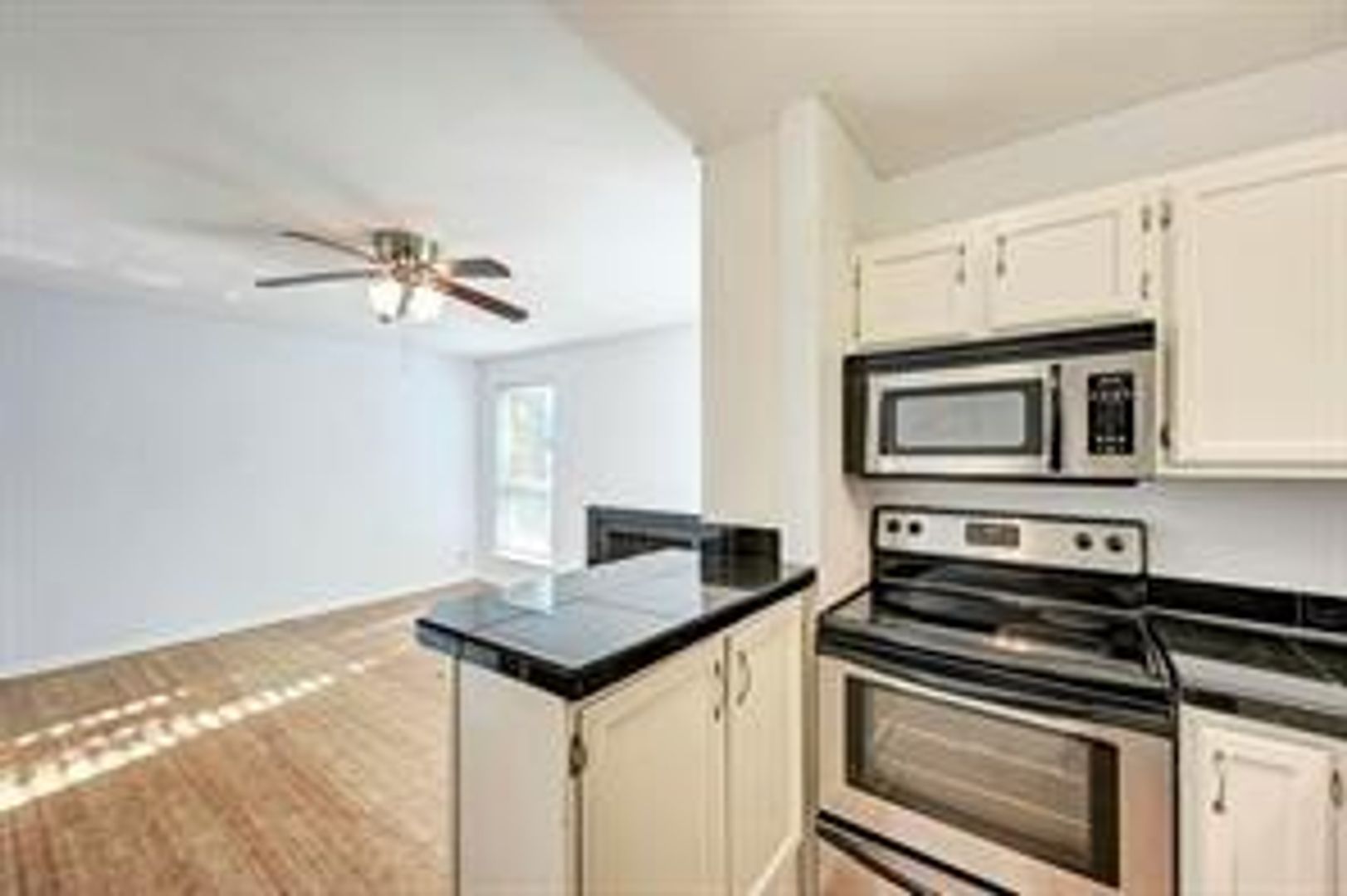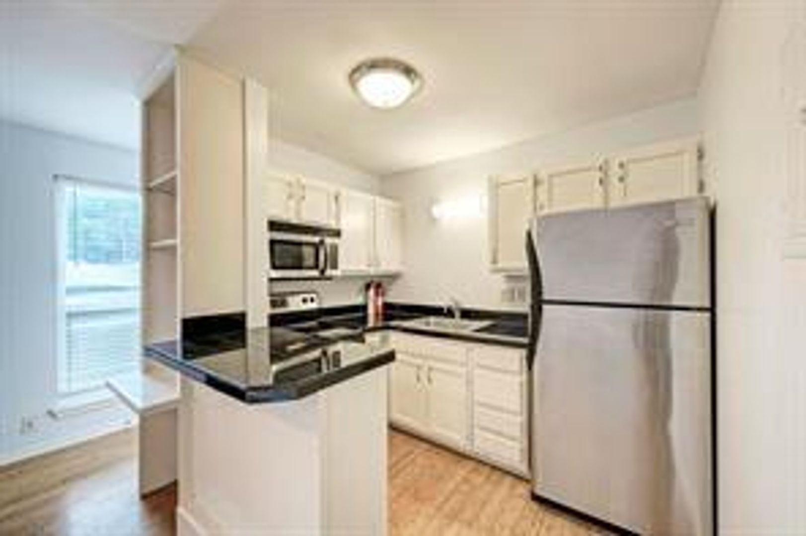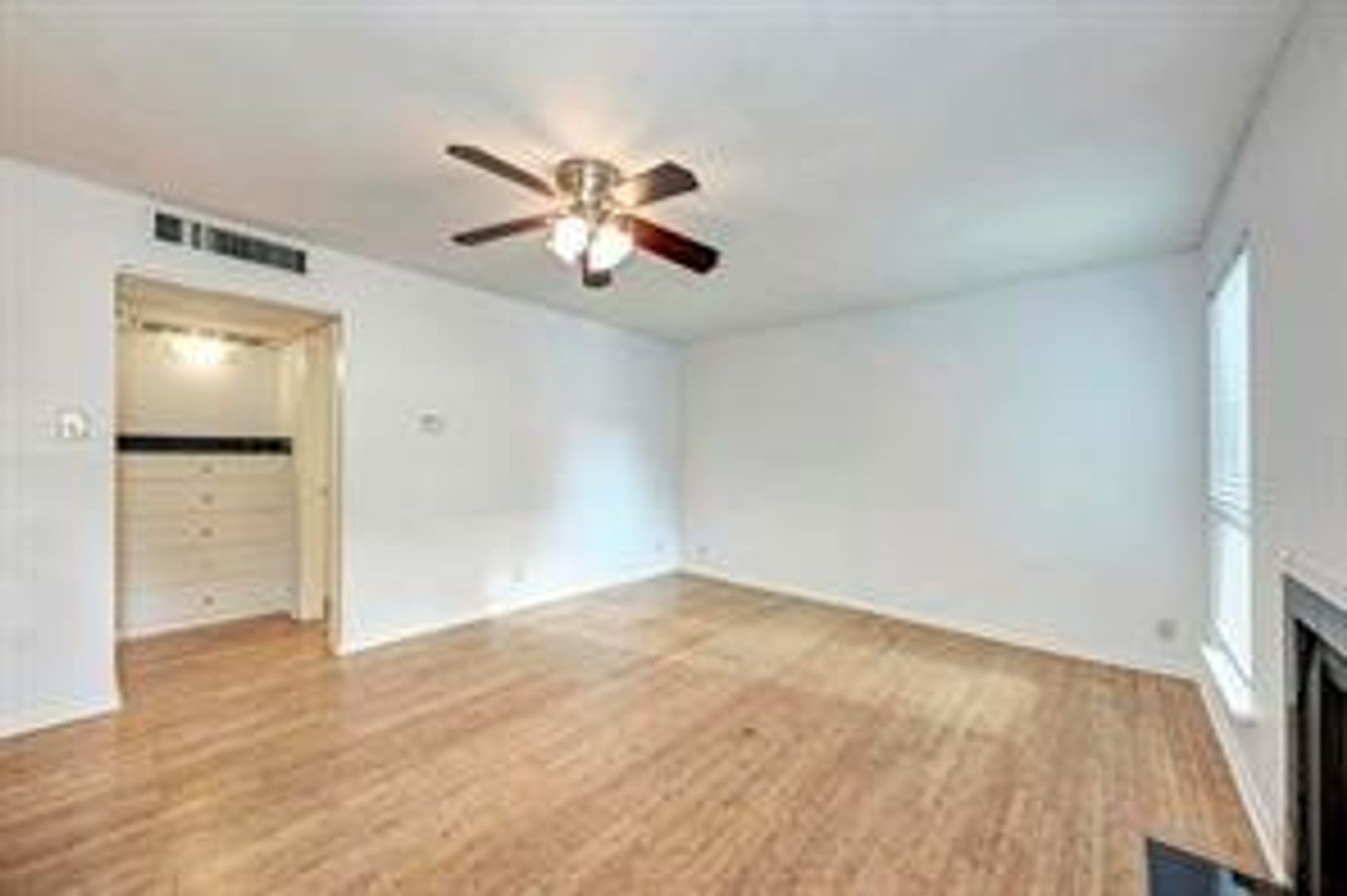 Unit features hard flooring, a stainless sink, stainless refrigerator, a walk-in closet, built-in dresser, and a wood burning fireplace.